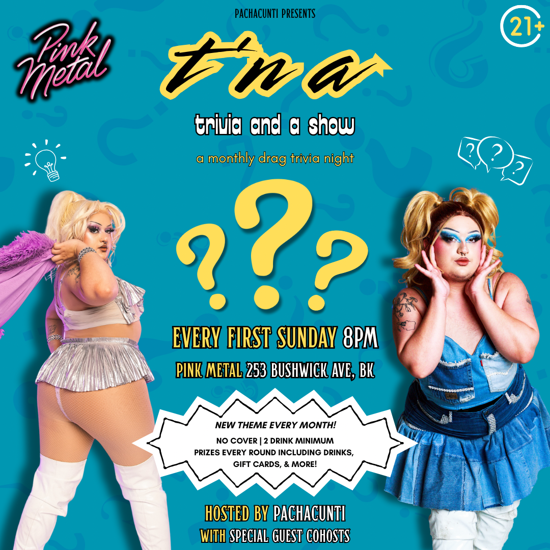 A $5 ENTERTAINMENT FEE WILL BE ADDED TO ALL BAR TABS DURING SHOWS T ‘n A TRIVIADRAG TRIVIAEVERY 1ST SUNDAY @ 8PMNO COVER // TIPS ENCOURAGEDHOSTED BY PACHA CVNTI